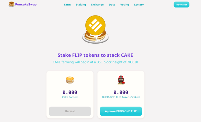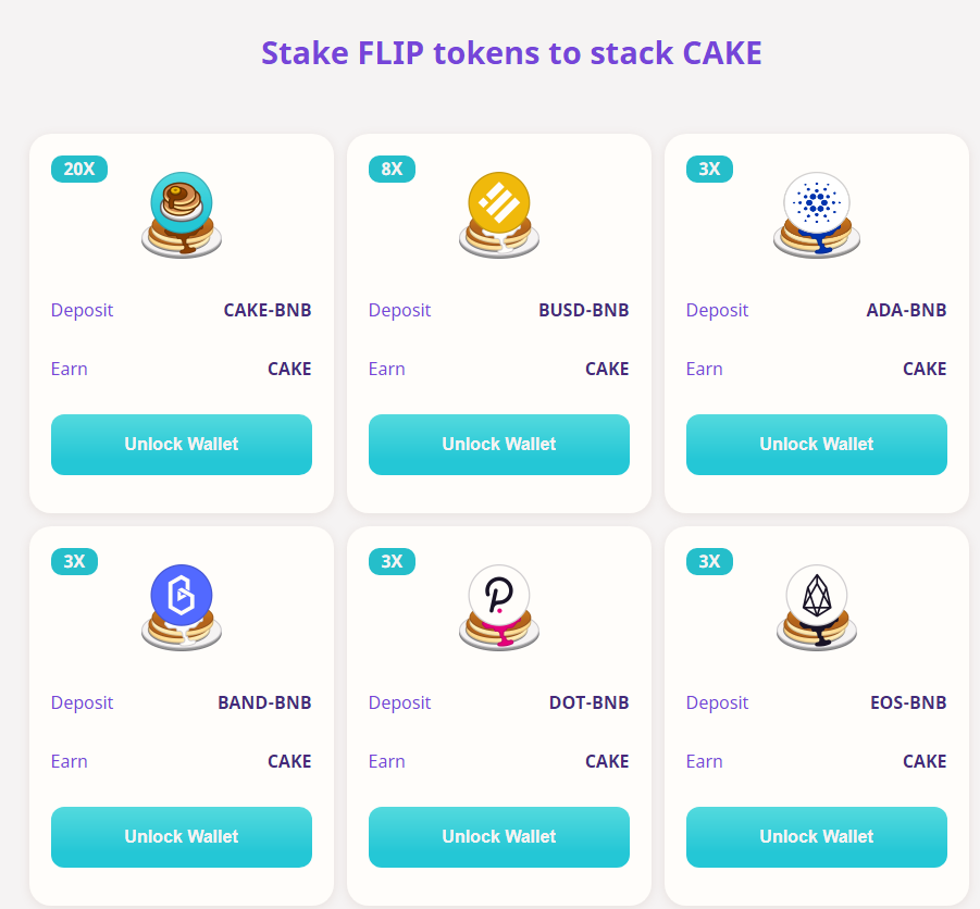 LP token ของ PancakeSwap เรียกว่า FLIP ยกตัวอย่างเช่น หากคุณใส่ BUSD และ BNB ลงใน pool คุณจะได้รับโทเค็น BNB-USDT FLIP เป็นการตอบแทน หรือ BAND และ BNB คุณจะได้รับโทเค็น BAND-BNB FLIP