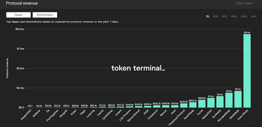 ภาพสะท้อนถึงรายรับของเกม Axie Infinity — 7 วันที่ผ่านมาเทียบกับ Dapps อื่น ๆ Axie Infinity นั้นทำรายได้ถึง 9.4 ล้านเหรียญสหรัฐ ถ้าเทียบเป็น % การเติบโตเท่ากับ 126% ซึ่งสูงกว่ารายได้รวมของ MetaMask, PancakeSwap, Synthetix และ MakerDAO