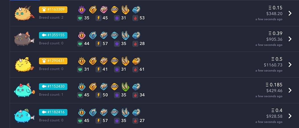ราคาเฉลี่ยของตัว Axie ต่อ 1 ตัวนั้น ในปัจจุบันนั้นเริ่มตั้ง 0.0865 ETH ($176.09) — 1000 ETH+ ($2,032,830) เลยก็มีเช่นกัน ขึ้นอยู่กับ status ความสามารถของตัว Axie นั้น ๆ ยิ่งหากมีค่า status ที่สูงราคาก็จะสูงตามเช่นกัน