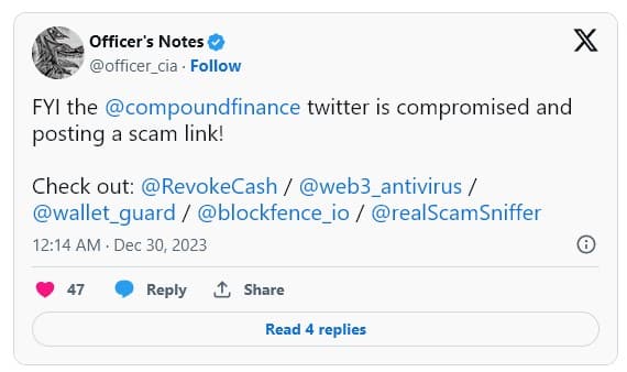 บัญชี X (เดิมชื่อ Twitter) ของ Compound Finance โปรโตคอลการเงินแบบกระจายอำนาจ (DeFi) ถูกแฮ็ก พร้อมแปะลิ้งค์เว็บไซต์ฟิชชิ่งปลอม ตามที่รายงานโดยบัญชี X ที่เกี่ยวข้องกับความปลอดภัย Scam Sniffer และ Officer’s Notes