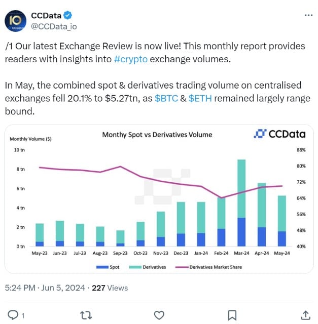ตามรายงานล่าสุดของ CCData ในเดือนพฤษภาคม 2024 พบว่า ตลาดสกุลเงินดิจิทัลมีการลดลงอย่างมากทั้งปริมาณการซื้อขายสปอตและอนุพันธ์