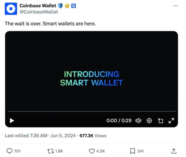 Coinbase เปิดตัวกระเป๋าเงินอัจฉริยะ Coinbase Wallet ใหม่ ที่จะมอบความสะดวกสบายให้กับผู้ใช้มากขึ้น รวมทั้งกำจัดค่าธรรมเนียม Gas และทำให้ขั้นตอนการกู้คืนไม่จำเป็น