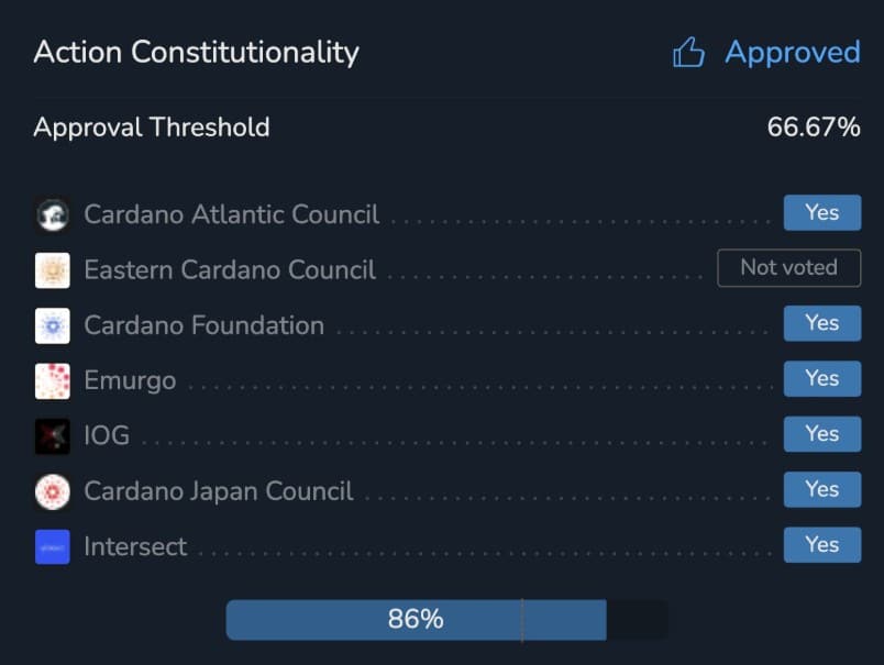การฮาร์ดฟอร์กต้องให้ผู้ดำเนินการ staking pool อัปเกรดโหนดของตนและอนุมัติการอัปเกรดด้วยคะแนนเสียงข้างมาก 51% ซึ่ง ณ วันที่ 22 มกราคม โหนดเครือข่ายของ Cardano 78% ได้อัปเกรดเป็นเวอร์ชันใหม่แล้ว ตามรายงานวันที่ 23 มกราคม จาก Emurgo ซึ่งเป็นสมาชิกที่มีสิทธิออกเสียงของ Interim Constitutional Committee (ICC) ของ Cardano ที่สนับสนุนการฮาร์ดฟอร์ก