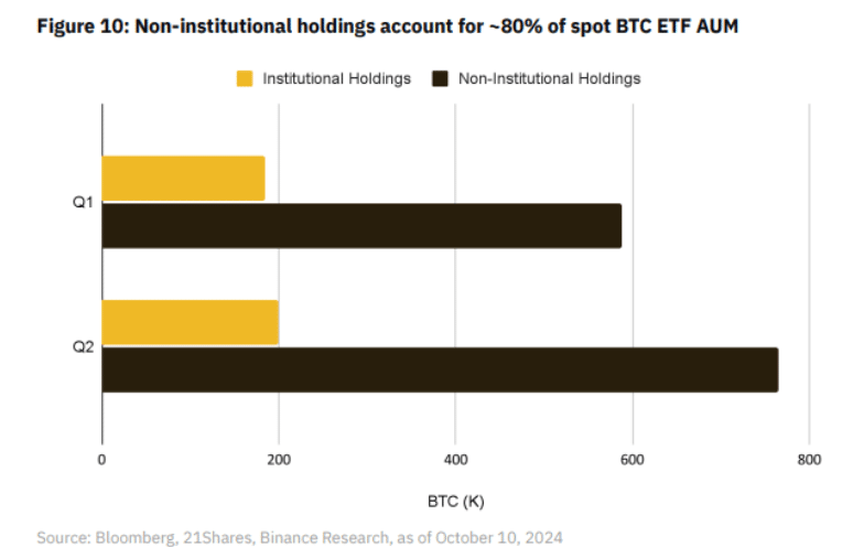 รายงานการวิจัยของ Binance เมื่อเดือนตุลาคม 2024 พบว่า 80% ของความต้องการ Bitcoin ETF มาจากนักลงทุนรายย่อย