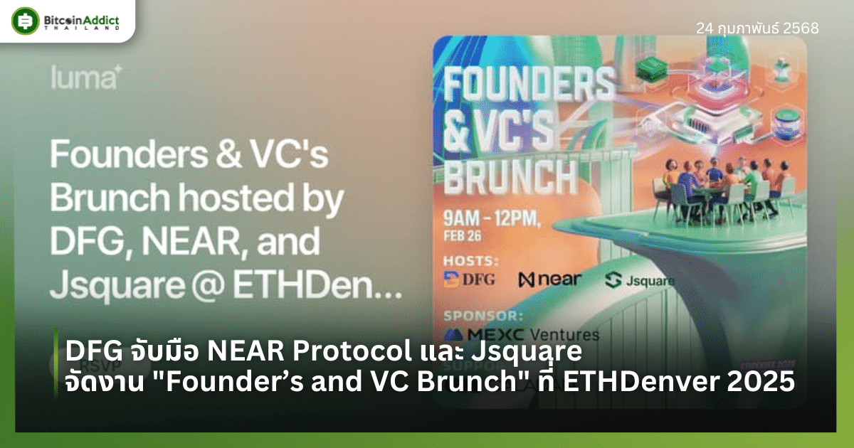 เดนเวอร์, โคโลราโด – 17 กุมภาพันธ์ 2568 – DFG บริษัทลงทุนด้านบล็อกเชนและคริปโตเคอร์เรนซีระดับโลก ประกาศความร่วมมือกับ NEAR Protocol และ Jsquare จัดงาน “Founder’s and VC Brunch” ในงานประชุม ETHDenver ปีนี้ ณ เมืองเดนเวอร์ รัฐโคโลราโด โดยมีเป้าหมายเพื่อสร้างพื้นที่พบปะระหว่างนักลงทุนและโครงการบล็อกเชนระยะเริ่มต้น พร้อมเปิดโอกาสให้ Venture Capital (VC) เข้าถึงสตาร์ทอัพและผู้ก่อตั้งที่ผ่านการคัดเลือกมาแล้วอย่างเข้มข้น