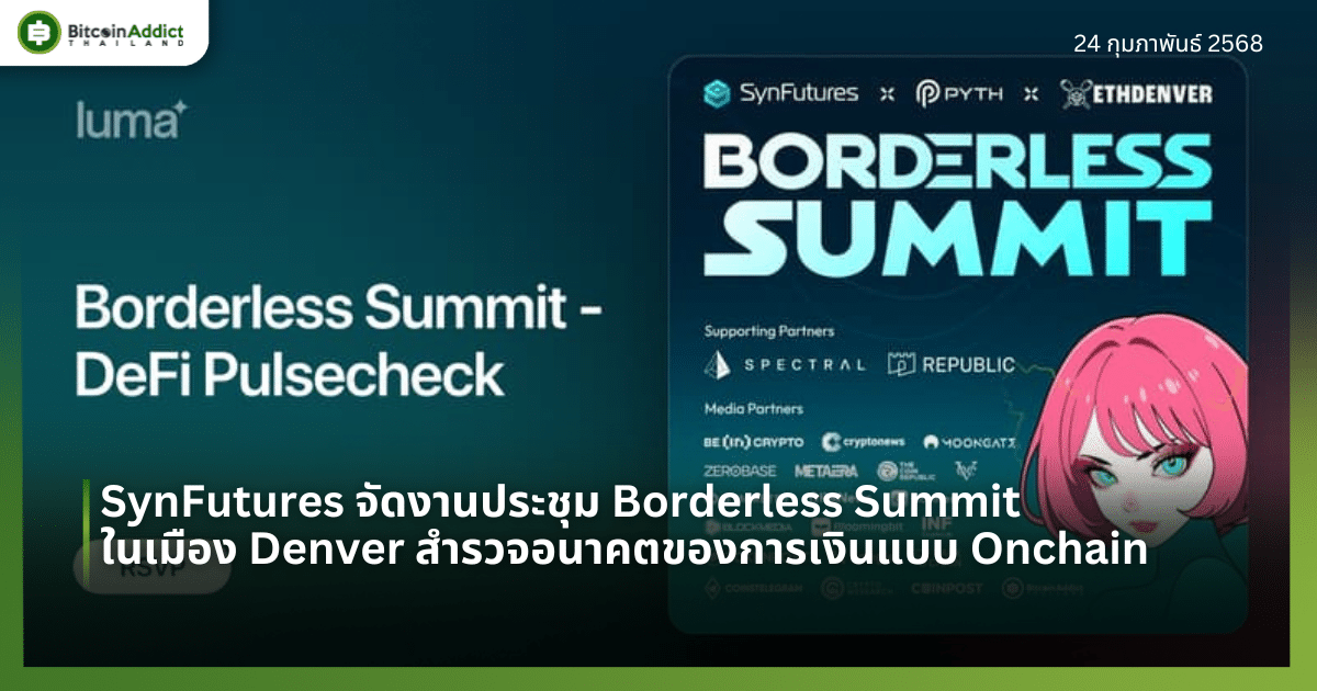 SynFutures ผู้ให้บริการ DEX สัญญาซื้อขายล่วงหน้าแบบ Perpetual อันดับต้นๆ บน Base ประกาศจัดงานประชุมสุดยอด Borderless Summit ภายใต้หัวข้อ “DeFi Pulsecheck: ภาพรวมของอนาคต Onchain” ในช่วงงาน ETH Denver วันที่ 27 กุมภาพันธ์ 2025 งานนี้จัดขึ้นโดยความร่วมมือกับ Pyth Network เครือข่าย Oracle ที่ใหญ่ที่สุดและน่าเชื่อถือที่สุดแห่งหนึ่ง และ Spectral โครงสร้างพื้นฐานสำหรับการสร้างเศรษฐกิจตัวแทนแบบ Onchain
