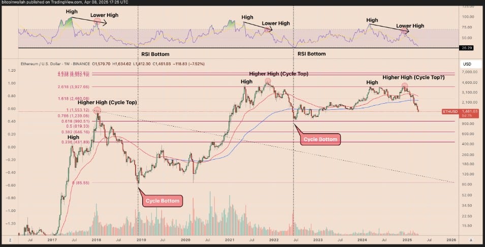 พฤติกรรมราคาของ ETH ในตอนนี้กำลังคล้ายกับ “รูปแบบ Fractal เดิม” ที่เคยเกิดขึ้นในปี 2018 และ 2022 โดยในทั้งสองกรณี ราคาของ ETH พุ่งขึ้นแรงในช่วงตลาดกระทิง ก่อนร่วงลงอย่างรวดเร็วและเข้าสู่ตลาดหมี