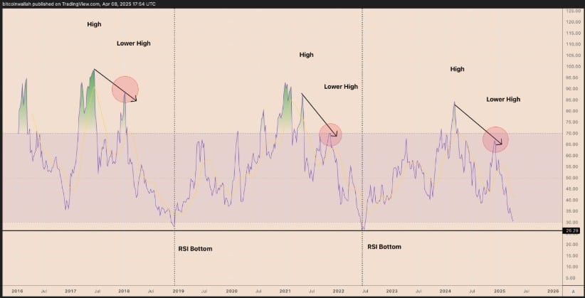 โครงสร้างของตลาดตอนนี้กำลังคล้ายกับรูปแบบนั้น โดยในเดือนธันวาคม 2024 ETH ทำจุดสูงสุดใหม่บริเวณ $4,095 ขณะที่ RSI กลับทำจุดสูงสุดต่ำลง ซึ่งเป็นสัญญาณ Divergence แบบเดียวกับที่เคยเกิดก่อนการปรับฐานในปี 2018 และ 2022