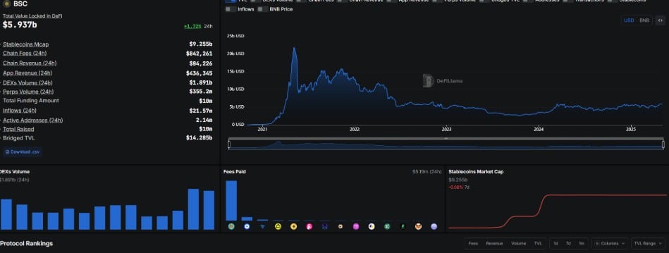 ตัวอย่างโปรโตคอลยอดนิยมบน BNB Chain เช่น PancakeSwap ที่มี TVL ราว $1.5 พันล้าน