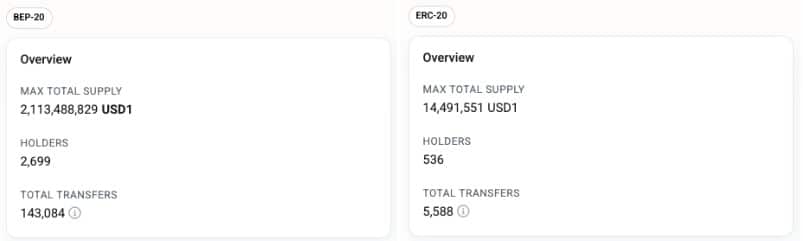อีกประเด็นสำคัญคือการเปิดตัว USD1 Stablecoin ที่หนุนหลังโดยอดีตประธานาธิบดีโดนัลด์ ทรัมป์ โดยออกบน BNB Chain เกือบทั้งหมด (99% ของ Supply) มูลค่ารวมกว่า $2 พันล้าน ตามข้อมูลจาก BscScan