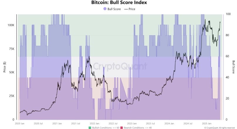 - ข้อมูลจาก CryptoQuant เผยว่า ดัชนี Bitcoin Bull Score Index ซึ่งวัดความมั่นใจของนักลงทุน พุ่งจากระดับ 20 ไปแตะ 80 ภายในระยะเวลาอันสั้น ซึ่งเป็นระดับที่มักเชื่อมโยงกับการพุ่งขึ้นของราคาในอดีต