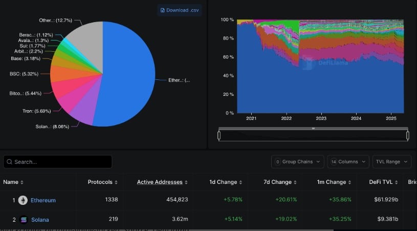 จากข้อมูลของ DefiLlama Ethereum ยังคงเป็นผู้นำในโลก DeFi โดยมีส่วนแบ่งมูลค่าทรัพย์สินที่ถูกล็อกไว้ (TVL) ระหว่าง 50-60% ของทุกบล็อกเชน ตั้งแต่ปี 2022 จนถึงปัจจุบัน โดยล่าสุด TVL ของ Ethereum อยู่ที่เกือบ $80 พันล้าน