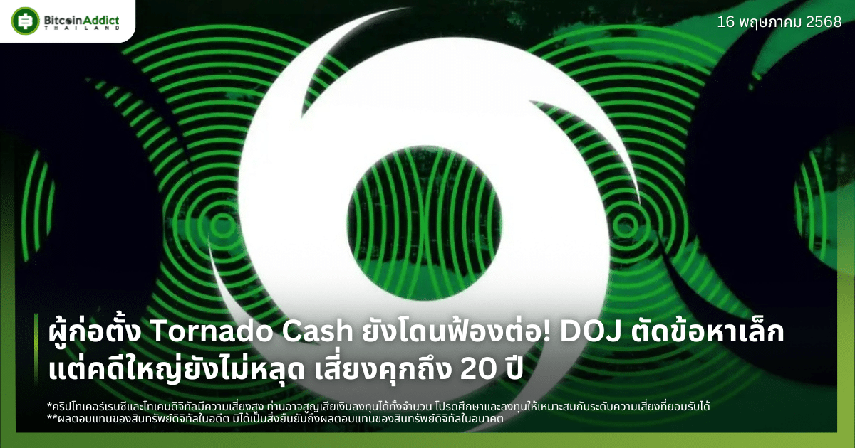 ผู้ก่อตั้ง Tornado Cash ยังโดนฟ้องต่อ! DOJ ตัดข้อหาเล็ก แต่คดีใหญ่ยังไม่หลุด เสี่ยงคุกถึง 20 ปี