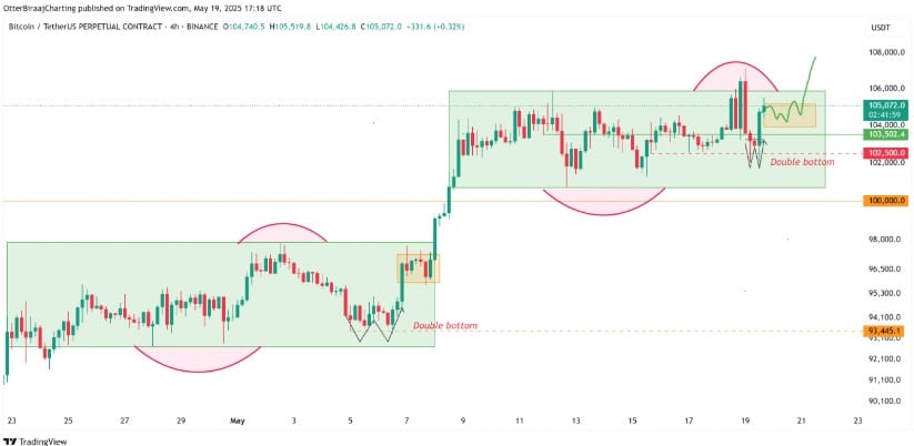 รูปแบบ fractal ยังสะท้อนว่า ช่วงราคาปัจจุบัน ($100,600 – $106,300) มีลักษณะคล้ายกับช่วง $92,700 – $97,900 ก่อนหน้านี้ ซึ่งนำไปสู่การเบรกขึ้น
