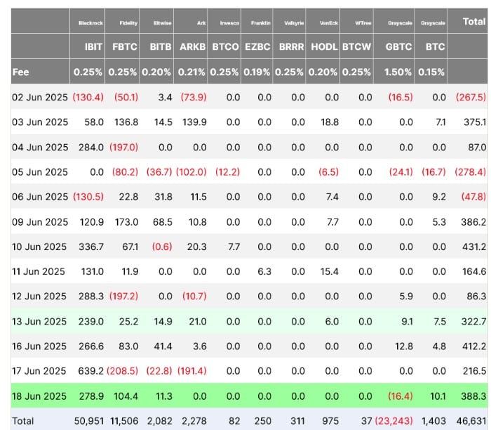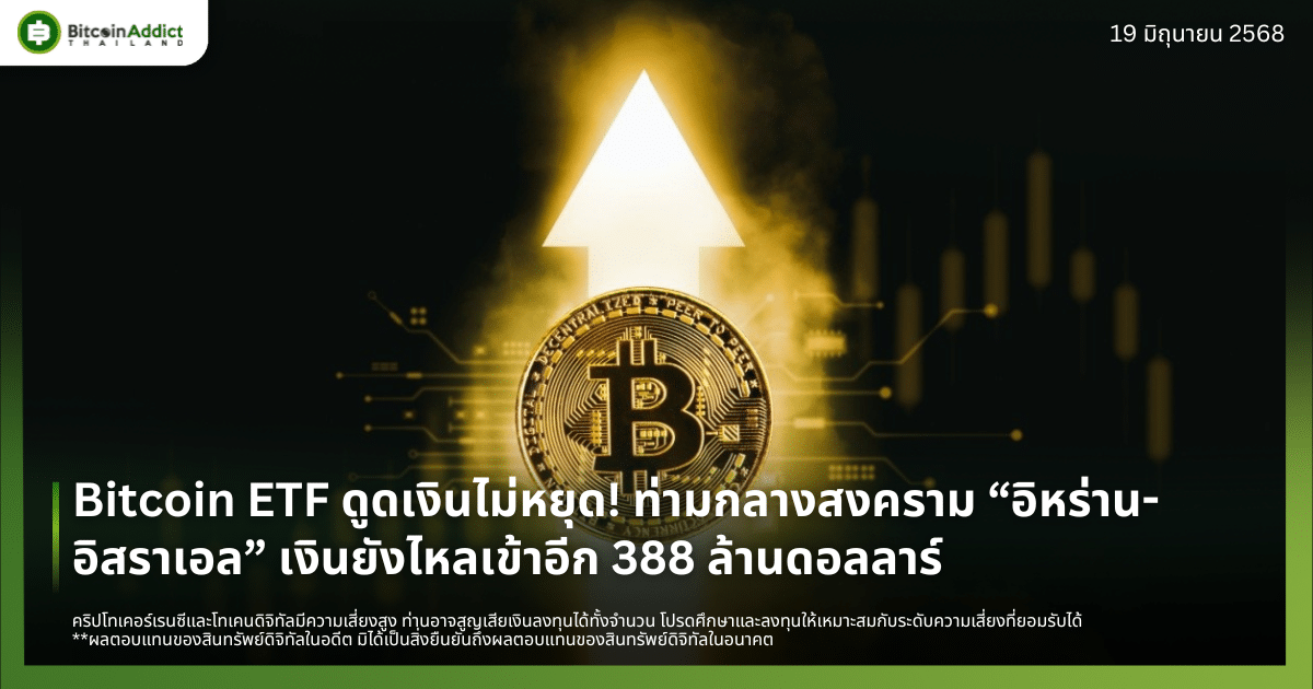 กองทุน Bitcoin แบบ Spot ในสหรัฐฯ ยังคงดึงดูดเม็ดเงินต่อเนื่อง โดยมีเงินไหลเข้าอีก 388.3 ล้านดอลลาร์ ในวันพุธที่ผ่านมา ทำให้เป็นวันที่ 8 ติดต่อกันที่มีกระแสเงินใหม่ไหลเข้าสู่กองทุนเหล่านี้ แม้ตลาดจะปั่นป่วนจากเหตุการณ์ความขัดแย้งระหว่างอิสราเอลและอิหร่าน