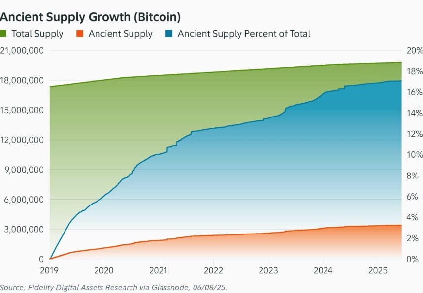 จำนวนเหรียญ BTC ที่ถูกถือครองยาวนานกว่า 10 ปี (เรียกว่า “Ancient Supply”) มีแนวโน้มเพิ่มขึ้นเฉลี่ย 550 BTC ต่อวัน