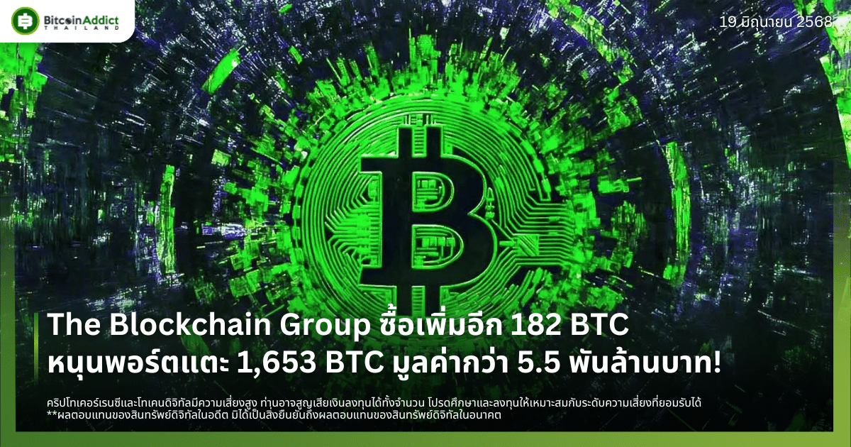 The Blockchain Group บริษัทเทคโนโลยีสัญชาติฝรั่งเศสที่จดทะเบียนในตลาดหุ้นปารีส ได้ประกาศซื้อ Bitcoin เพิ่มอีก 182 เหรียญ มูลค่าประมาณ 19.6 ล้านดอลลาร์ ส่งผลให้บริษัทถือครอง BTC รวมแล้วกว่า 1,653 เหรียญ คิดเป็นมูลค่ากว่า 170 ล้านดอลลาร์ หรือราว 5.5 พันล้านบาท ณ ราคาตลาดปัจจุบัน
