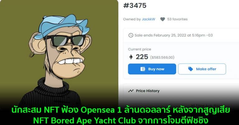 นักสะสม NFT ฟ้อง Opensea 1 ล้านดอลลาร์ หลังจากสูญเสีย NFT Bored Ape Yacht Club จากการโจมตีฟิชชิง